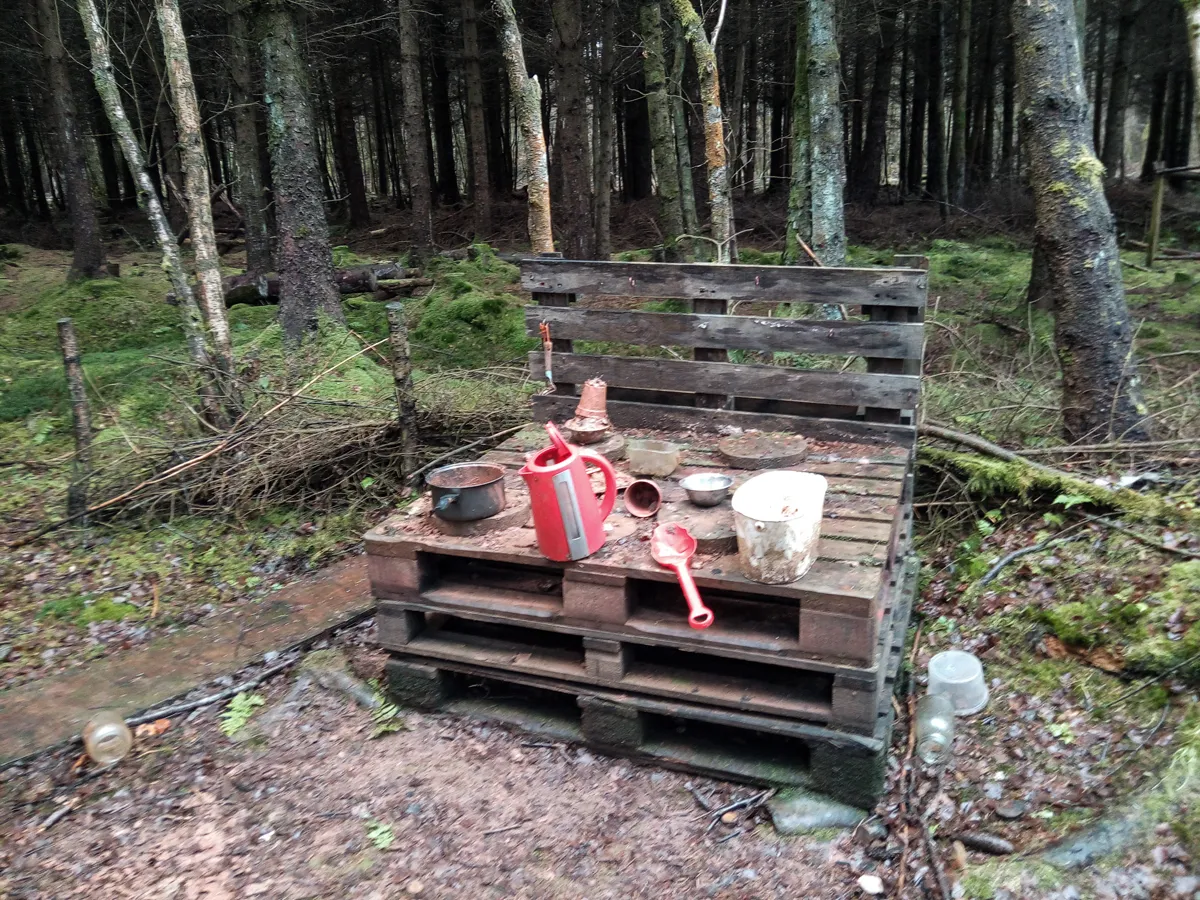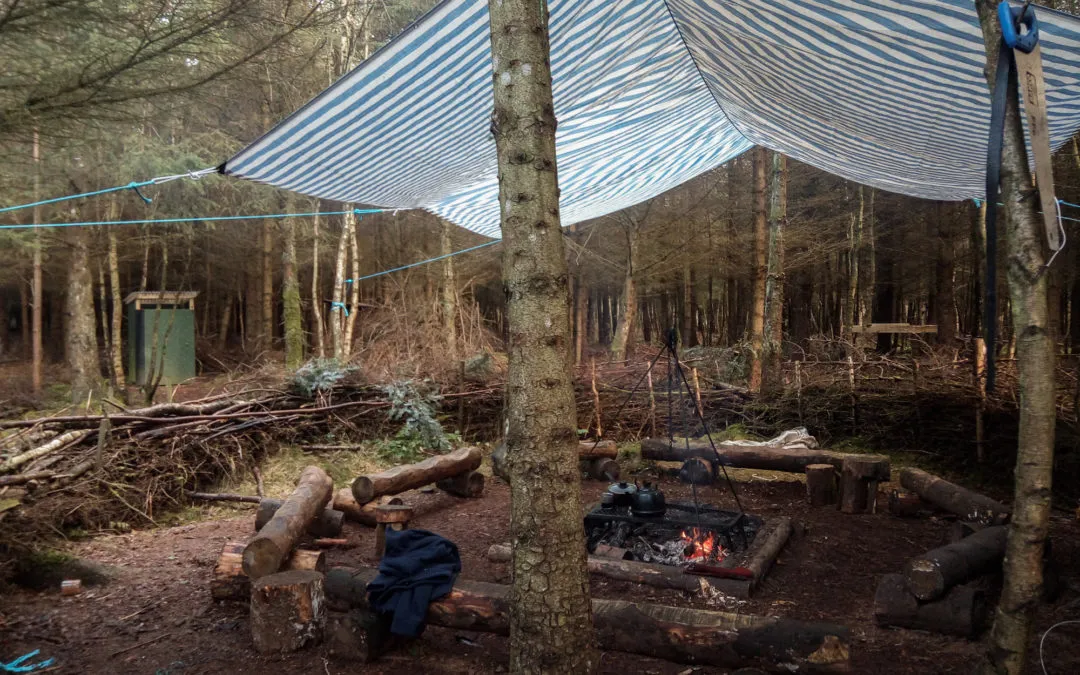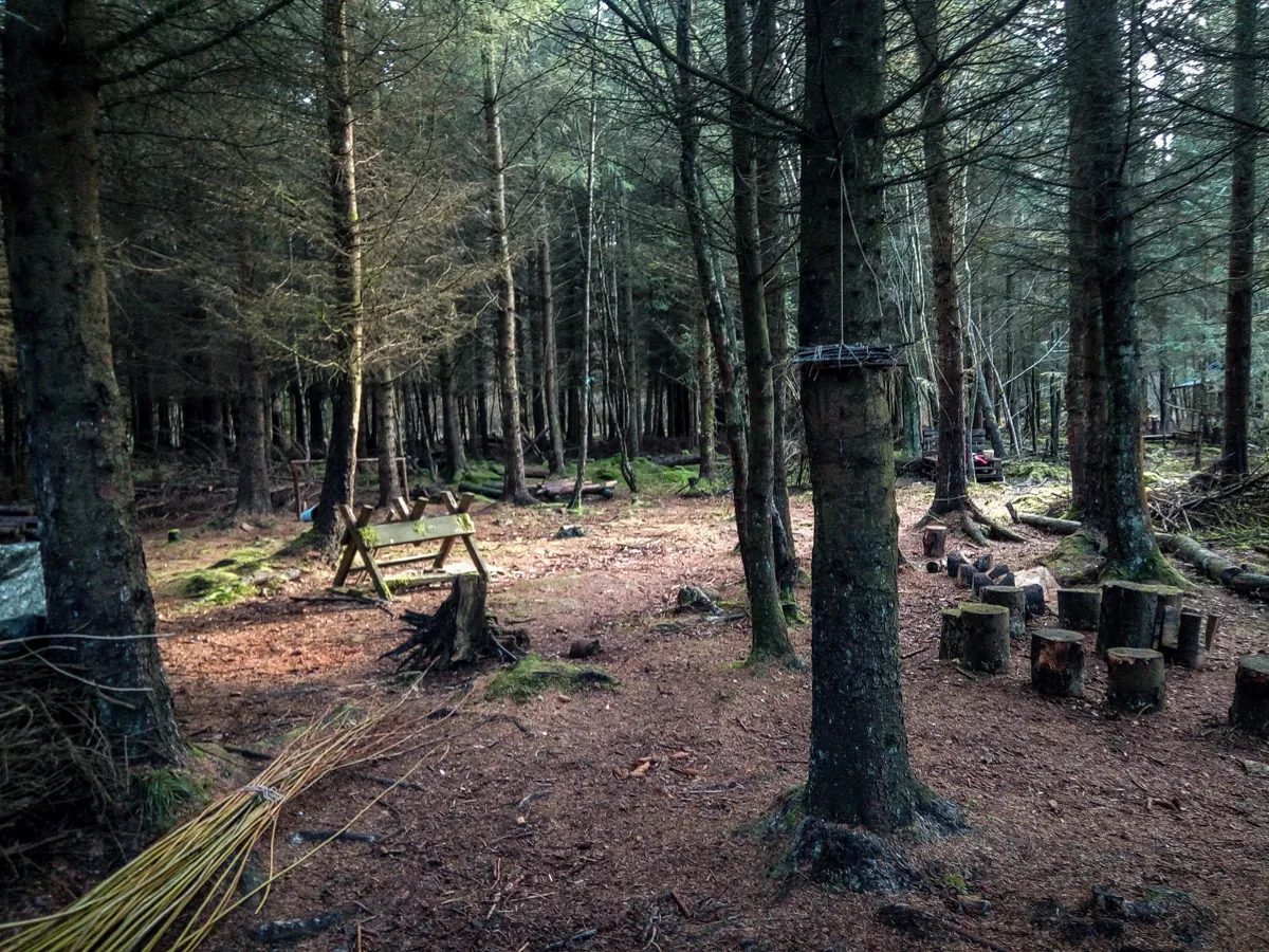 Pierwsze, co rzuciło mi się w oczy, to brak budynków. Sticks and Stones Forest School to po prostu obozowisko w środku lasu, otoczone pomarańczowym sznurkiem, poza który nie wychodzi się podczas pobytu tutaj. Sercem tego wydzielonego miejsca jest palenisko z ławeczkami z ogrodzeniem z gałęzi i naciągniętymi na linki płóciennymi daszkami oraz małą wiatą na przedmioty używane w szkole: naczynia, narzędzia. Całość wykonana przez opiekunów i dzieci.